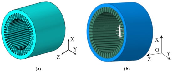 Equivalent finite element model of stator core and stator system. (a) stator core; (b) stator system.