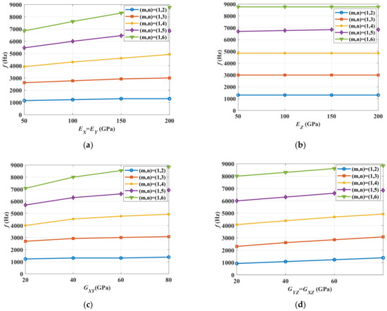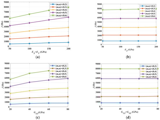 Anisotropic material property influence on stator core modal frequency of m = 1. (a) Effects of EX and EY; (b) Effects of EZ; (c) Effects of GXY; (d) Effects of GYZ and GXZ.