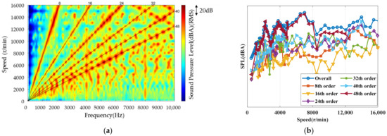 Taking the 1 m acoustic measurement point in the rear as an example, the acoustic results of this measurement point are shown in Figure 5. From Figure 5a, it can be seen that based on the eighth order and its eighth integer multiple orders, the overall contribution to the sound pressure is larger, and there are more obvious resonance bands near 4000 Hz and 8000 Hz. From the comparison of the overall sound pressure and each order in Figure 5b, it can be seen that the 48th order noise has the largest contribution to the overall sound pressure in the full speed range. In the range of 0 to 7000 rpm, the 48th order noise amplitude increases with the increase of speed. There are obvious peak points near 2000 rpm and 7000 rpm. In the range of 7000 rpm to 16,000 rpm, the 48th order noise amplitude decreases with the increase of speed. In the range of 0 to 7000 rpm, the overall 48th order noise amplitude increases with the increase of speed, and there are obvious peak points near 2000 rpm and 7000 rpm, and in the range of 7000 rpm to 16,000 rpm, the overall 48th order noise amplitude decreases with the increase of speed.
