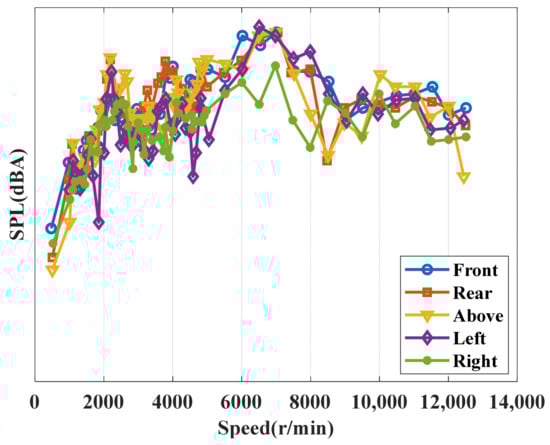 Viewing the simulation results of the five acoustic measurement points at 1 m, the conclusions are consistent with the acoustic measurement points at the rear 1 m, where the 48th order noise summary results of the five acoustic measurement points are shown in Figure 6. It can be seen that in the range of 0 to 7000 rpm, the overall 48th order noise amplitude increases with the increase of speed, and there are more obvious peak points near 2000 rpm and 7000 rpm; in the range of 7000 rpm to 16,000 rpm, the overall 48th order noise amplitude decreases with the increase of speed.