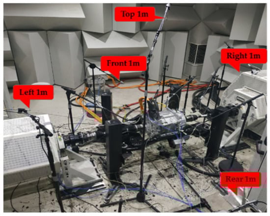 In the anechoic chamber, the electromagnetic noise of the permanent magnet synchronous motor was tested under full-load acceleration conditions, and the LMS SCADAS SCM205 multi-channel data acquisition equipment was used at the test front end, and the microphones were arranged in the 2in1 system near the top, front, rear, left and right side of the shell surface at 1 m. The overall experimental arrangement is shown in Figure 7.