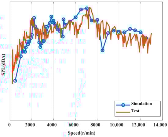 Taking the microphone measurement point at 1 m in the rear as an example, the simulated and tested 48th order comparison results are shown in Figure 8. It can be seen that in the speed range from 0 to 7000 rpm, the simulated and tested 48th order noise amplitude generally increases with the increase of speed, and there are obvious peak points near 2000 rpm and 7000 rpm in both simulated and tested results; in the speed range from 7000 to 13,000 rpm, the 48th order noise amplitude generally decreases with the increase of speed. The simulated and tested results are in good agreement in the full speed range, thus verifying the effectiveness of the coupled electromagnetic-structural-acoustic multi-physical field simulation of the permanent magnet synchronous motor established in this paper. In the speed range from 0 to 7000 rpm, the overall 48th order noise amplitude increases with increasing speed, and there are obvious peak points near 2000 rpm and 7000 rpm; in the speed range from 7000 to 13,000 rpm, the overall 48th order noise amplitude decreases with increasing speed. This result further verifies the validity of the multi-physics field coupling model.