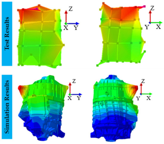 To address the problem of the peak electromagnetic noise near 2000 rpm in the simulated and measured 2in1 system (the electromagnetic noise in this speed range is very likely to cause passenger irritation and customer complaints), an Operational Deflection Shape (ODS) test experiment was designed to investigate the mechanism of this problem. Forty-four vibration sensors were placed on the surface of the 2in1 system, and vibration tests were conducted under full-load acceleration conditions. The vibration results under the acceleration condition were extracted and the ODS test results at the 48th order frequency (1600 Hz) under the 2000 rpm speed condition were shown in Figure 9, which shows that the 2in1 system exhibits the overall torsional vibration at this frequency, especially the maximum amplitude of torsional vibration on the drive axle side. Correspondingly, the simulation results of ODS at the 48th order corresponding frequency for this speed condition are shown in Figure 10, which shows that the overall torsional vibration with the largest amplitude of torsional vibration on the drive axle side is shown, and this conclusion is consistent with the ODS test results.
