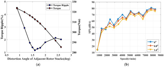 Optimization results of different skew angles. (a). Comparison of torque amplitude and torque ripple at different skew angles; (b) Comparison of sound pressure levels at different skew angles.