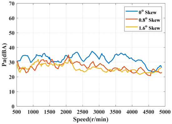 At the same time, the samples of rotors with different oblique angles are made, and the vehicle bench test in the semi-anechoic chamber is carried out. The test results are shown in Figure 11. From the bench test results, it can be concluded that the 1.6° skew angle indeed significantly reduces the 48th order noise.