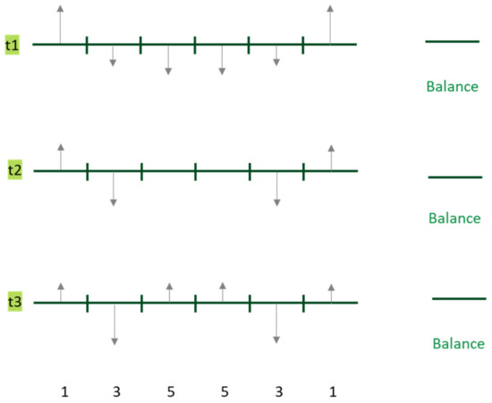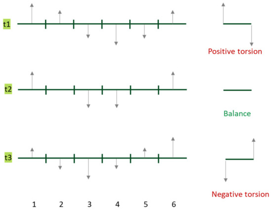 The above tests have proved that the tilt of each segment of the rotor at a certain angle can effectively reduce the 48th order electromagnetic noise caused by the cogging torque. However, in the test, it was found that the 48th order electromagnetic noise has a significant peak when the motor is accelerated to 2000 revolutions, which can be about 5–10 dB (A) higher than the surrounding speed. This phenomenon is studied from the aspect of the electromagnetic excitation source. In the aspect of electromagnetic excitation, it is introduced that a part of the 48th order electromagnetic noise can be reduced by changing the angle of the rotor skew. However, after the rotor tilts at a certain angle, the tangential direction of the electromagnetic force is transformed by Fourier transform to extract the 48th order electromagnetic force, and the rotor segmentation analysis is carried out by randomly intercepting three times: t1, t2 and t3, in the 48th order electromagnetic force cycle. The results show that the unbalanced electromagnetic force exists in the 48th order at three times, as shown in Figure 12. That is to say, the six-stage laminated rotor itself always outputs a 48th order torsional electromagnetic force, coupled with the addition of torsional modes in the transmission process, which leads to the increase of 48-order noise when the bridge is accelerated to 2000 rpm.