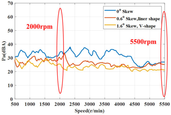 Combined with the analysis of the 48th order noise from the previous rotor skew angle, we used the previous 1.6° skew angle scheme of each stacked piece to process and manufacture the 1.6° electric drive sample of ‘V’ shape, and compared it with the previous original ‘liner’ shape sample and the 1.6° skew angle sample. The results are shown in Figure 14. It can be seen from the results that the 48th order noise level of 1.6° with the ‘V’ shape is the lowest under the commonly used 5500 rpm of the motor. Due to the absence of torsional electromagnetic force at 2000 rpm, the acceleration noise linearity is more peaceful.