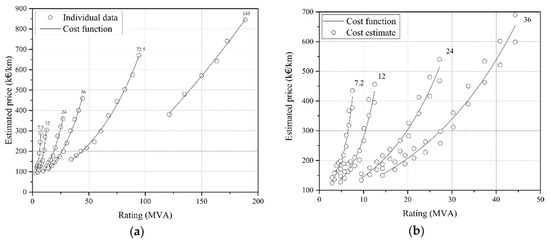 Cost data for offshore cables, where the number above each curve is the rated voltage in kV: (a) static offshore cable; (b) dynamic offshore cable. Reproduced with permission from [16].