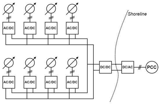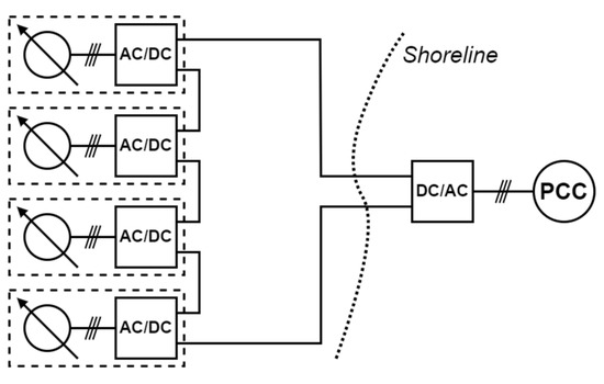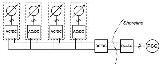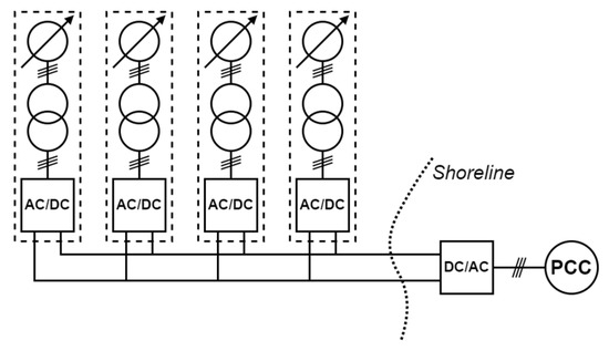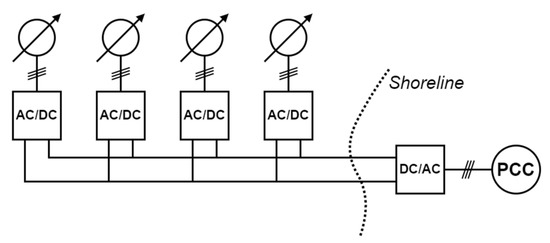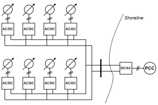 Although no large farms with marine energy converters have been constructed and the research on the subject is non-extensive, a report [13] has discussed various grid layouts for marine energy resources. In the report, it was noted that the traditional assumption in the design of electrical systems for marine energy resources entailed an analogous application of the technologies used in offshore wind. Therefore, the discussed topologies have often been based on AC collection and transmission, as in [14,15]. It was, however, also observed in [13] that a system solely based on medium-voltage DC for the internal collection of power in a farm and transmission of power to the shore could bring advantages regarding the size and cost of cables. Furthermore, since the use of DC technologies makes it possible to downsize components, it is of interest to study the possibility of using DC collection and DC transmission for marine energy resources.