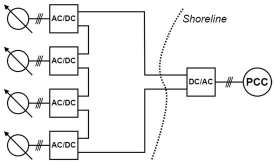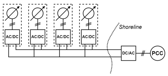 Multiple topologies of parallel DC collection grids can be considered. An important issue is how multiple units are aggregated offshore. In Figure 6, one of the most basic parallel DC collection grid topologies is illustrated. The energy converters are connected radially to a feeder cable, which is connected directly to an onshore inverter. There is no offshore collection point or substation. This topology is characterized by no redundancy due to the use of a single feeder cable. The system is primarily suitable for near-shore applications since there is no central offshore boosting of the voltage before transmission to the shore. This means that every single unit needs to increase the generated voltage to the voltage level of the collection grid. Depending on the technology for generating a DC voltage, this will put various constraints on how much the voltage can be increased from an individual energy converter [36]. The total current transmitted to shore can simply be expressed, as in Equation (1), as the sum of the currents from each respective energy converter , where is the specific unit.