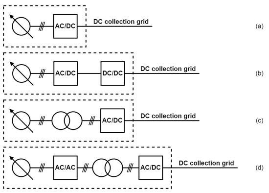A characteristic of all of the DC collection grid topologies discussed above is the DC voltage output from the energy conversion unit, for example, the wind turbine. The power generation is usually in AC; therefore, an AC to DC conversion step is necessary. This can be achieved in several ways, and an overview of different technologies can be found in [37]. A couple of variants of these strategies are illustrated in Figure 10. The simplest concept is shown in Figure 10a and consists of a one-step rectifier. It could either be an active or passive rectifier. One of the main limitations of this topology is that the output DC voltage from the energy converter is limited by the nominal terminal voltage of the generator [37]. This topology also lacks galvanic isolation.
