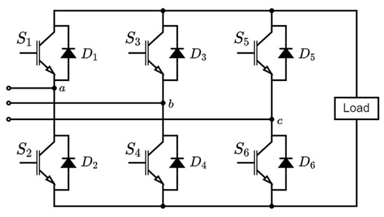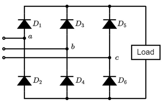 The main function of an AC/DC converter (rectifier) is to transform an AC waveform into a DC waveform. In the most ideal case, the AC waveform is sinusoidal and the DC is a constant value. There are two main categories of AC/DC converters: passive and active rectifiers. A passive rectifier is constructed with passive rectifier diodes, and for a three-phase system, one topology is the three-phase full-bridge rectifier, which is shown in Figure 11 (see, for example, [36]). The phase voltages , and are rectified to the load. The output from the full-bridge rectifier will inherently contain harmonics; therefore, it will, in most applications, be necessary to filter the output. It should also be noted that, with a passive rectifier, there is no active control of the rectification process.