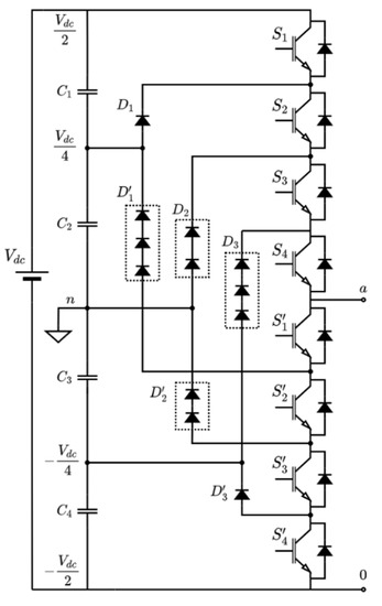 A large variety of DC/AC converters (inverters) are available—see, for example, [45,46,47]. The basic operation of an inverter is to generate an output voltage with a stepped waveform from a DC input voltage. Increasing the number of voltage levels makes the stepped waveform approach a sinusoidal AC waveform [48]. As an example of a DC/AC converter that could be used in a DC collection grid, a five-level diode-clamped inverter is illustrated in Figure 13. The diodes are used to balance the voltage over the switches, and, for five levels, the required voltage blocking level of the switches is . The reverse-blocking voltage of the diodes will, however, differ. The diodes and need to be able to block . For larger DC voltages, it will, therefore, be necessary to series-connect multiple diodes. If all diodes are assumed to have the same rating, the number of diodes needed in one phase will be given by , where m is the number of voltage levels of the inverter [47]. The number of diodes is, therefore, increased quadratically with regards to . This quadratic increase in the number of diodes usually puts a feasibility limit on the number of voltage levels of the converter at five levels [47]. After five levels, the number of diodes needed to be connected in series becomes unmanageable.