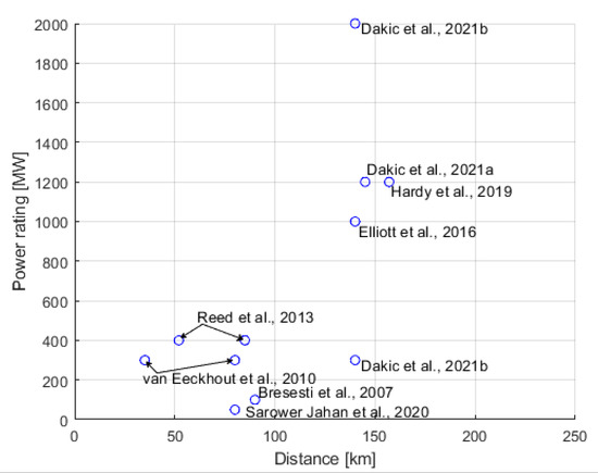 - Dakic, J.; Cheah-Mane, M.; Gomis-Bellmunt, O.; Prieto-Araujo, E. HVAC Transmission System for Offshore Wind Power Plants Including Mid-Cable Reactive Power Compensation: Optimal Design and Comparison to VSC-HVDC Transmission. IEEE Trans. Power Deliv. 2021, 36, 2814–2824. [Google Scholar] [CrossRef]