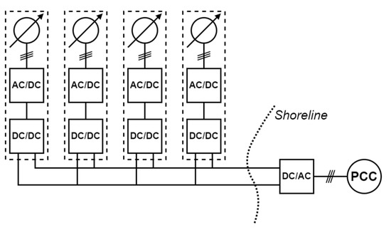 The use of DC, not only for transmission to the shore, but also for the internal collection grid, has attracted increasing attention. For wind power, multiple studies have been carried out on the subject and various topologies have been proposed. A feasibility analysis in [8] proposed four different DC collection grid topologies and showed that they had comparable capital costs to conventional AC collection grids. In [9], a series DC collection grid comprising an AC/AC converter, a high-frequency (HF) transformer and a diode bridge rectifier was proposed. The topology was improved in [10,11] by comparing the losses and improving the efficiency by utilizing different power converters and increasing the operating frequency of the transformers. A review paper compared string, cluster and series DC collection topology with conventional AC for offshore wind [12]. Research regarding offshore DC collection grids has primarily been focused on offshore wind applications, and has not often been expanded to marine energy in general.