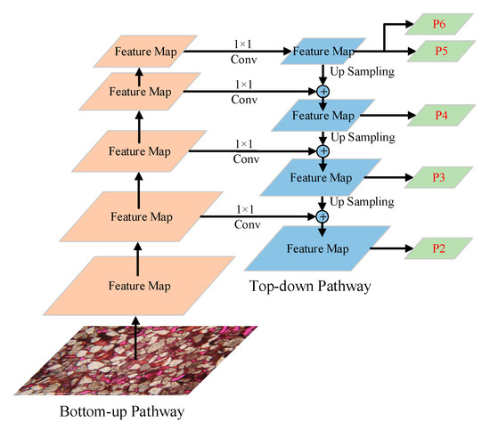 - The backbone consists of ResNet101 [31] and Feature Pyramid Network (FPN), as marked by ③ in Figure 1. ResNet101 extracts image features through residual network to obtain the feature layer; FPN extracts the features and semantic values of each component in the feature layer by undersampling, and then generates the effective feature layer (P2, P3, P4, P5, P6) [32] by upsampling and fusion of feature layers, to complete feature extraction, as shown in Figure 2.