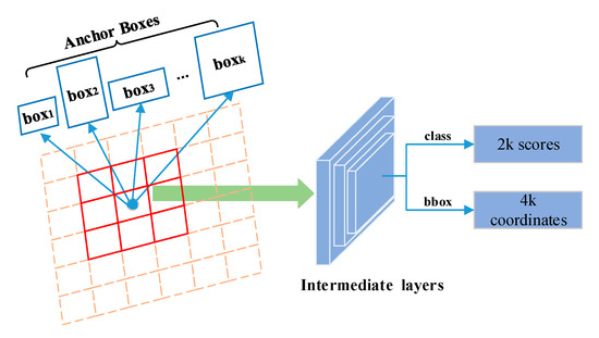 - The ROI area is the area where the region proposal network (RPN) slides on the effective feature layer to obtain and output the possible slice components [33], as marked by ④ in Figure 1. The RPN consists of a binary classification network and a regression network. The former detects the slice components of the candidate area by judging the intersection over union value (IOU) in region proposals, and the latter outputs the edge boxes of each component region proposal. The RPN structure is shown in Figure 3. If the region proposal detected by the binary classification network does not contain components, the edge box is invalid. Each ROI area is finally adjusted to ROI align of the same size.