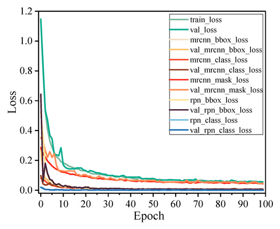- The segmentation and recognition part is composed of fully connected layers and mask branch, as marked by ⑤ in Figure 1. Fully connected layers identify each component category with ROI align as input, and regress and refine the edge box of each component; mask branch applies a small fully connected network to generate pixel-level object masks for each component in ROI align and complete the instance segmentation of components. The total loss function of Mask R-CNN can be defined by Equation (2) [20], where is the recognition process loss; is the box regression loss; is the segmentation loss.