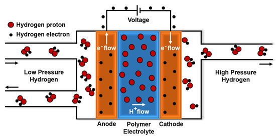 The hydrogen can be pressurized up to several hundred bars with a single cell [26]. Furthermore, the EHC operates hydrogen separation, compression, and purification in only one compact device.