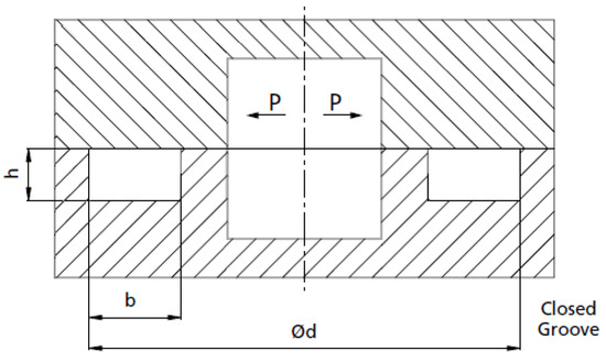 The metal ring was chosen to keep the groove width b as small as possible because it increases the plate’s effective length (Figure 6). The ring has a free height (cross-section diameter of the ring) of and an external diameter inside the range of . As reported in its technical data-sheet, the groove width is , while the groove depth is .