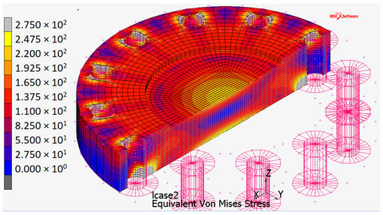 The diffusion of hydrogen within mechanical components made of stainless steel is known to induce the embrittlement phenomenon, consisting of the reduction of the plastic strains locally attainable before failure [12,13,14,15]. Consequently, the ultimate tensile stress and the fatigue response of stainless steel are negatively affected by pressure-driven diffusion of hydrogen within the alloy [14], while surface fracture can even be induced by cathodic charging with no outer stress applied [12]. In the application at hand, the contact between the surface of the compressor end-plates and the hydrogen flow is rather limited to the small-sized orifices and channels where the hydrogen is allowed to flow, so no large amounts of hydrogen can be expected to diffuse within the volume of the components. At the same time, such small-sized channels, holes, and irregular shape variations act as notches within the stressed mechanical component at hand, thus generating peaks of stress triaxiality, which further contribute to decreasing the ductility of metals at the local scale [31,32]. According to such considerations, the design of mechanical components to be continuously operated in hydrogen environments must be aimed at conservative levels of the nominal stress states. This is the reason why the stress states have been taken as the design parameter to be evaluated and designed by the finite element method for providing adequate structural integrity to the component.