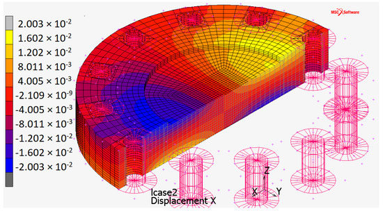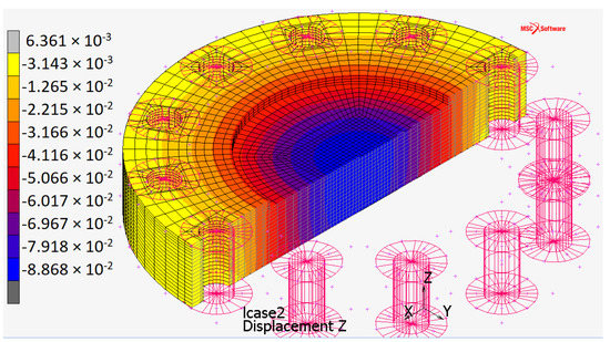 The simulation did not consider the second monopolar plate of the EHC, and infinitely rigid surfaces of washers constrained the top surface of the plate. The FEM simulation without top washers showed a 3.13% increase in deflection; hence the actual displacement along the z-axis will be within the range [0%, 3.13%].