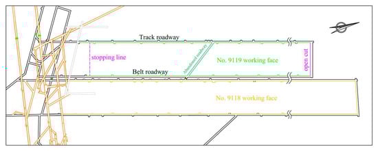 The Dongpang Mine is part of the Xingtai mining area of the coalfield in Xingtai City, Hebei Province, northern China. The main tectonic lines in this mine area are primarily east–west, north–east, and north–south. The Ordovician, Cambrian, Metasedimentary Great Wall System, and Taikoo Zanhuang Group are the underlying strata of the coal seam, with the Cambrian and Ordovician strata having a greater influence on coal mining. The No. 9119 working face at Dongpang Mine has an underground elevation of −220 to −274 m, leaving a 6 m net coal pillar in the middle of the No. 9118 working face that was previously recovered. An abandoned roadway is located between the track roadway and the belt roadway along the No. 9 coal seam. The sections of the roadway measure 4 m in width and 3 m in height. The layout of the working faces and the location of the abandoned roadway is shown in Figure 1.
