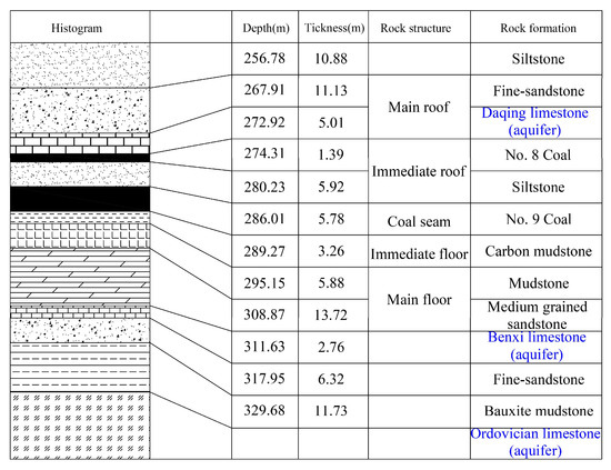 The Daqing limestone aquifer in the roof strata, Benxi limestone aquifer, and Ordovician limestone aquifer in the floor strata constitute most of the water source for the No. 9119 working face. The water from the Daqing limestone aquifer is released along the No. 9118 mining field and roadways, posing no threat to this working face. From the base of the No. 9 coal seam, the heights of the Benxi limestone aquifer and the Ordovician limestone aquifer are approximately 13.39–33.38 m (average 22.86 m) and 30.78–54.57 m (average 43.92 m), respectively. The failure zone on the floor of the No. 9 coal seam serves as the primary conduit for water from the Benxi limestone aquifer. However, it can be employed as an early detection and release method because it has a low water head and a steady amount of water. The greatest danger to this mining operation comes from the irregular water-rich and somewhat high-head Ordovician limestone aquifer. A geological histogram of the No. 9119 working face is shown in Figure 2.