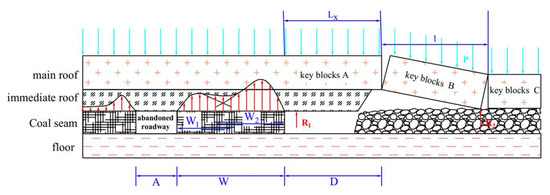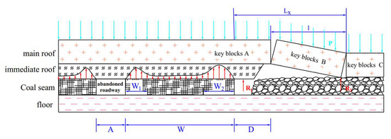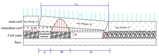 The coal pillar is not only required to carry the load of its own overlying strata but also the load of the overlying strata of one-half of the abandoned roadway and a significant portion of the load of the overlying strata of the cantilever beam on the goaf-side, so the static load set on the coal pillar is: