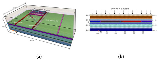 A 3D model with an x-axis of 302 m, y-axis of 180 m, and z-axis of 80 m was created, as shown in Figure 6a. The working face was 90 m long. Each cross-section of the track, belt, and abandoned roadways measured 4 m in width and 3 m in height, with a 53° angle between them. Given the lateral abutment stress, two coal pillars of 50 m width were set aside on either side of the No. 9118 and No. 9119 working faces. The main roof fractured periodically owing to the large distance of the open cut from the roadway intersection, which allowed the model to be excavated from the boundary section. The bottom of the model was fixed, and the horizontal movement of its four sides was constrained. The upper surface of the model, whose boundary conditions are schematically depicted in Figure 6b, was subjected to an even load of .