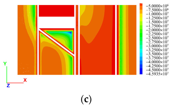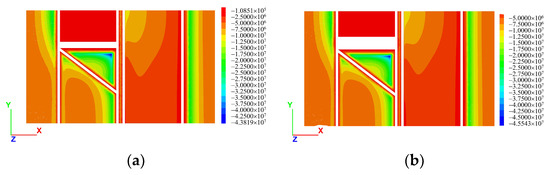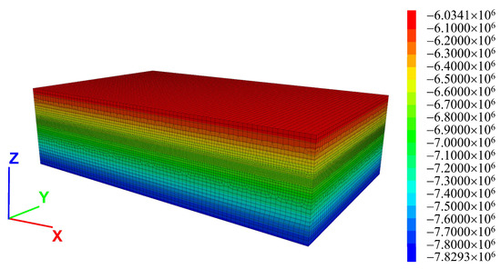 The vertical stress cloud of the initial ground stress measured in Pa is shown in Figure 7. The following clouds and diagrams units are Pa unless otherwise indicated. Before the mining field was excavated, the initial ground stress reached an equilibrium. From there, the stress increased consistently with depth, peaking at 7.8 MPa at the bottom of the model.