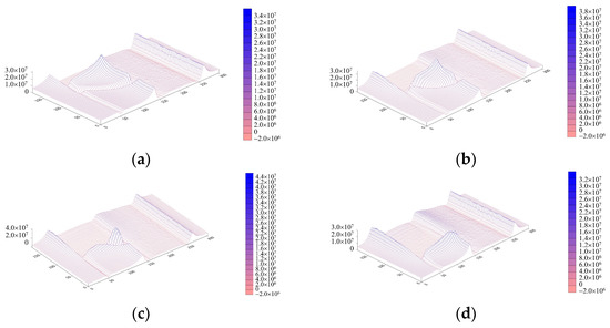 Three-dimensional diagrams of the vertical stress: (a) excavation of 30 m; (b) excavation of 60 m; (c) excavation of 90 m; (d) excavation of 120 m.
