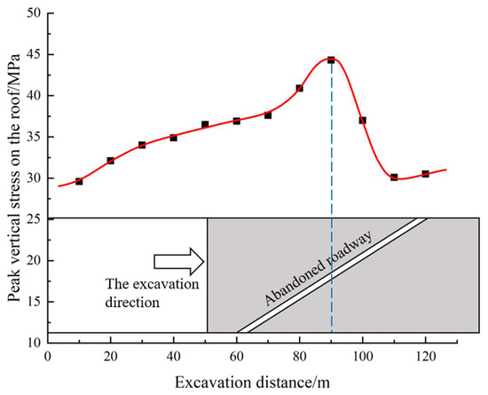 The relationship between the peak vertical stress 1 m above the roof and the mining position of the working face is shown in Figure 10. The peak stress increased slowly when the working face was farther from the abandoned roadway. The area of the triangular coal pillar gradually decreased as the working face continued to advance beyond 60 m, and the peak stress on the roof began to increase sharply. The maximum stress occurred at 90 m, where the working face passed through a semi-abandoned roadway, where the maximum stress reached 44.3 MPa. This was because the abandoned roadway cut off the coal body behind it and the triangular coal pillar, resulting in the superposition of the front abutment stress, the lateral abutment stress of the No. 9118 mining field, and the abutment stress of the abandoned roadway, which caused a large degree of stress concentration. The triangular coal pillar area decreased as the working face advanced, and as a result, it could no longer support the roof. Most of the abutment stress began to transfer to the coal body behind the abandoned roadway, which led to a more uniform distribution of the abutment stress. As a result, the peak abutment stress began to decrease until the working face completely passed and returned to the normal level.