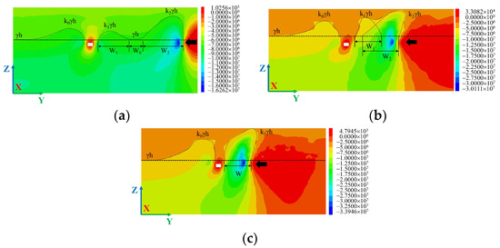 Side views of vertical stress cloud: (a) coal pillar width of 92 m; (b) coal pillar width of 52 m; (c) coal pillar width of 32 m.