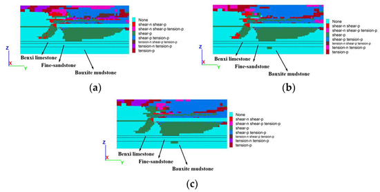From the above analysis, the largest front abutment stress occurred in front of the No. 9119 working face offset toward the No. 9118 mining field; therefore, the side views of the plastic zone near the No. 9118 mining field at 120 m of excavation were chosen, as shown in Figure 13. Shear failure primarily occurred in the plastic zone in the stope floor strata. Shear-n indicates that shear failure is occurring in the elements in the current cycle, while Shear-p indicates that shear failure has occurred in the elements in the previous cycle. Therefore, increasing the weighting step would cause the shear failure of the elements in front of the working face faster. The maximum depth of the plastic zone in the stope floor strata was 23 m when the weighing step was 10 m. The major portion of the plastic zone did not change significantly when the weighted step was increased to 20 and 30 m, but new plastic zones of various sizes appeared from 32 to 36 m below the floor, with the largest plastic zone occurring at 30 m. With the increase of the weighting step distance, the floor failure depth increased firstly and then tended to be stable [33]. Therefore, when the weighting step increased from 20 m to 30 m, the depth of the plastic zone did not change significantly. Combined with the physical and mechanical parameters of the floor strata, no plastic zone has arisen in the range of 23 m to 32 m below the floor because of the Benxi limestone and fine sandstone in this area, which are relatively hard in texture and have large shear and tensile strengths. A certain zone of plasticity developed because of the lithological weakness of the bauxite mudstone that lies beneath the fine sandstone, which could still be inferred from the fact that as the weighting step increased, the extent of the plastic zone in the stope floor strata increased, indicating an increase in the depth of floor failure. However, the floor failure depth would not increase indefinitely and would eventually become stable.
