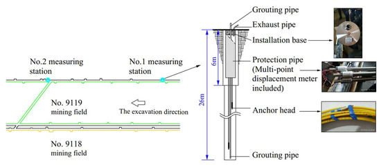 To monitor the displacement of the floor strata, vibrating wire multi-point displacement meters with two measuring stations were used at depths of 10, 15, 20, and 25 m below the floor. Station No. 1 was buried in the chamber of the track roadway away from and unaffected by the abandoned roadway, whereas station No. 2 was buried near the intersection of the track roadway and abandoned roadway, where it was affected by the abandoned roadway. The locations of the measuring stations and multi-point displacement meters are shown in Figure 15.