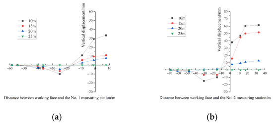 Relationship between the vertical displacement of each measuring point and the distance between the working face and the station: (a) No. 1 measuring station; (b) No. 2 measuring station.