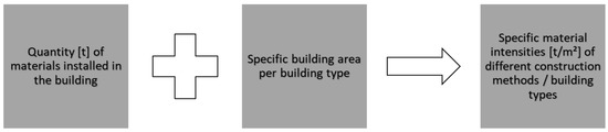 In this study, material flow analysis (MFA) as input data for building life cycle assessments is used to determine the quantity and intensity of materials in residential buildings. The mass balance method is used for this purpose. The balancing of materials was carried out based on working drawings of constructed buildings. A total of 46 new buildings were analysed in this study. The buildings were divided according to building type (single-family house and row houses (EFH), multi-storey building (MRB)) and according to construction type (mineral construction (M), timber construction (W)). The specific material intensities are calculated as area-related values in t/m2 GFA and volume-related values in t/m3 GV. The buildings are described in detail in [34,35]. There, the size, energy standard, and material choice are explained. By combining the specific material intensities with the construction types, the resource efficiency of the building types is derived (cf. Figure 1).