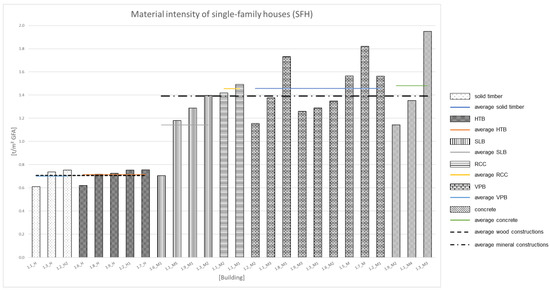 The average material intensity for mineral buildings at 1.39 t/m2 GFA is nearly twice as high as that of buildings with a wooden construction. Here, the average material intensity is 0.71 t/m2 GFA. Overall, the material intensity of mineral buildings shows a significantly wider range from 0.71 t/m2 GFA to 1.95 t/m2 GFA. Buildings with a wooden construction show a significantly lower range of material intensities from 0.61 t/m2 GFA to 0.75 t/m2 GFA. Figure 2 shows the results of the SFH for the area related material intensity [t/m2 GFA].
