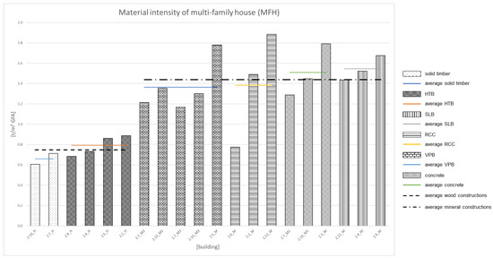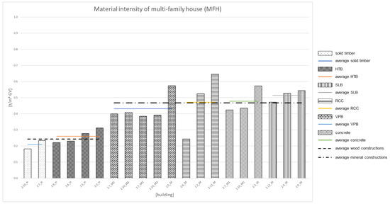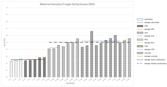 The order of wood construction (mass timber and then wood panel construction) is identical for the SFH and MRB. For mineral buildings, the order changes. Differences can be seen in mineral buildings. The buildings with a sand-lime brick construction show the lowest material intensities on average in mineral SFH, whereas buildings made of sand-lime brick show the highest values for MRB. There are also changes in the order for vertically perforated brick constructions. These buildings show the second highest values in the SFH, while in MRB they show the lowest values on average for mineral building.