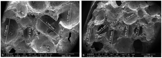 In order to illustrate the bimodal pore structure of ACCs, the photos taken with a scanning electron microscope are shown in Figure 1. Samples of two different apparent densities (450 and 600 kg/m3) were photographed. Regardless of the differences in the apparent density, both samples show large pores with a diameter close to 10−3 m, which are usually enclosed by a microporous skeleton formed by mineral structures. The fine pores of the skeleton, formed together with the solid material, constitute a binary system with a continuous, interpenetrating structure.