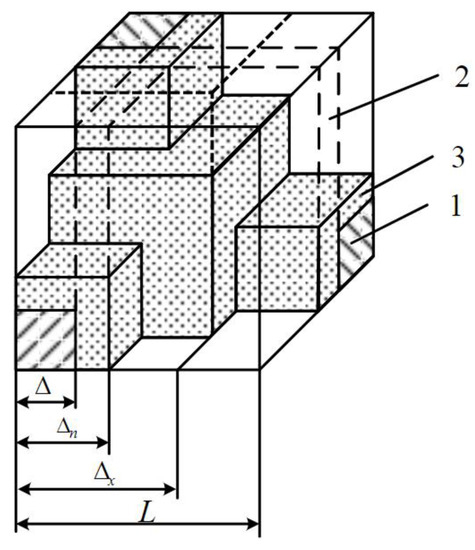 If the volume of the liquid Vw does not exceed a certain limit value Vw′, then the liquid is distributed in the porous space in the form of isolated inclusions. This case is described in detail in [11]. In what follows a ternary system for which Vw > Vw′ will be considered. In a general case, the structure of such an arrangement, according to [11,12], can be represented in the form of the eighth part of the unit cell illustrated in Figure 2. Figure 2 shows that the volume of the liquid Vw covering bars of the solid skeleton with dimension Δ can be conditionally divided into two parts of dimensions Δx and Δn. It is assumed that, when the pore moisture content changes, the value of Δx remains constant. The justification for this assumption is given in [11].