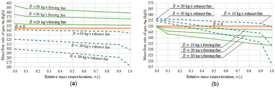 - Such differences in gas density between duct sections due to the presence of local sources of gas with varying densities generate mechanical energy in the inclined parts of the duct through which average-density gas is flowing. This energy is associated with a change in the existing buoyancy in this section. This value is defined as natural head and is included for the suction mode of the fan in Formula (29). The local natural head can be negative or positive, depending on the height difference of a duct in which an average-density gas mixture is flowing. This value may differ between duct sections, due to an exhaust or forcing fan. For the same local source of gas mass with a steady flow density, the local natural head for the suction mode is slightly lower than for the blowing mode, as follows from Formulas (31), (32), (37) and (38) for ∆z = 0. The source of gas mass is located at the end of the duct, with the fan working in the suction mode, and conversely, if the source is located at the entry of the duct, with the fan working in the blowing mode, the local natural head is equal to zero.