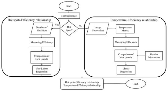 Abnormal power generation causes anomalies to appear on the surfaces of solar panels. The influence of the presence of hotspots in the modules is well-known qualitatively, but the quantitative effect of the number of hotspots on the efficiency of solar panels is rarely seen in the literature to the best of the authors’ knowledge. In order to estimate a module’s efficiency, this research compares the output of a brand-new solar panel, a solar panel with hotspot damage and temperature anomalies and a solar panel with temperature anomalies but no hotspots. Figure 1 presents the proposed process for analyzing the relationship between temperature and efficiency and the relationship between the number of hotspots and efficiency.