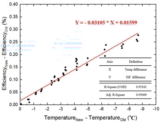 This research obtains the temperature–efficiency relationship by first taking the temperature difference between a new solar panel and an old solar panel without hotspots and then analyzing their difference in efficiency via linear regression. The “old” modules are those that have been used for a while but for less than the lifetime limit of 20 years. They are certain to degrade after some use, but most of them are without hotspots. However, their temperatures are generally higher than the new modules during operation.