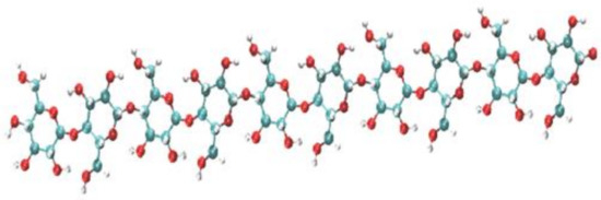 Cellulose molecular structure. Red: oxygen atoms; white: hydrogen atoms; blue: carbon atoms.