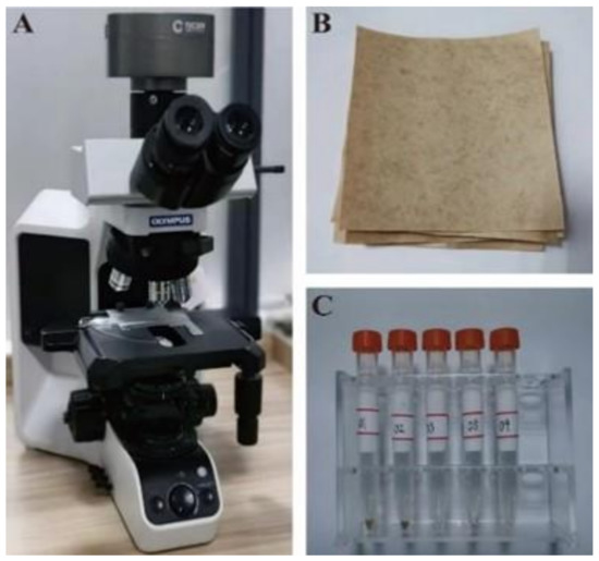 Experimental setup: (A) microscope; (B) insulating paper; (C) transformer oil samples.