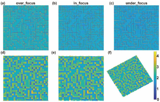 It is known that the phase values of the random phase plate are approximately 0 to π. Figure 5a–c represent three images of random phase plates with different focal lengths; Figure 5d–f represent the phase distributions. Different depth colors in the phase figure represent different phase values. As can be seen in Figure 5, the reliability of the method for restoring the shape of the object performs well.