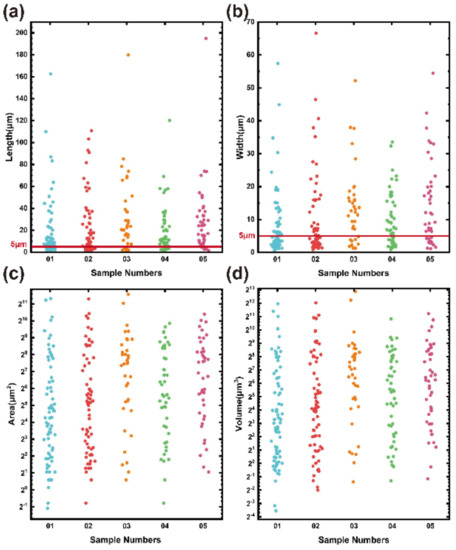In order to better reflect the morphological information of the cellulose particles and prove the feasibility of the method, the length, width, area, and volume data of the cellulose particles were selected for statistical analysis. Among the 270 cellulose particles that were observed, the maximum and minimum lengths were 194.92 and 0.82 μm, the maximum and minimum widths were 66.64 and 0.53 μm, the maximum and minimum areas were 3048.60 and 0.47 μm2, and the maximum and minimum volumes were 7489.44 and 8.51 × 10−2 μm3. Currently, in the detection of cellulose particles, it is often necessary to be able to measure particles with diameters that are less than or equal to 5 μm. Therefore, the proposed method can meet the requirements for the detection of cellulose particles.