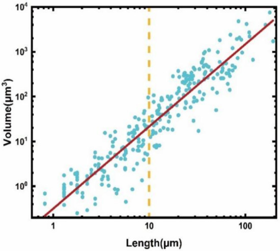 As can be seen from the red line in Figure 7, the length and volume of the cellulose particles had a proportional relationship; generally, the length increased with volume, but the volume information of cellulose particles could not be represented by the length information of the cellulose particles. From the yellow dashed line in Figure 7, it can be seen that the volume of cellulose particles with similar lengths often differed greatly.